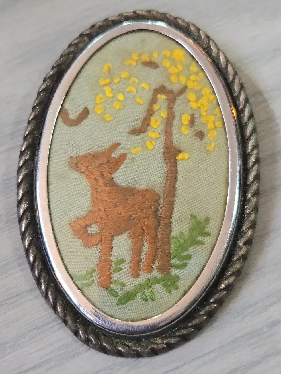 Embroidered Needlepoint Scenic Deer Under Tree Pin Brooch Antique