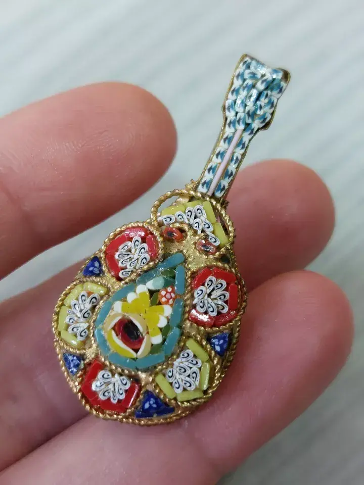 Vintage/ Antique Micro Mosaic Brooch/ Pin In Form Of A Guitar- Italy Cc 1920's