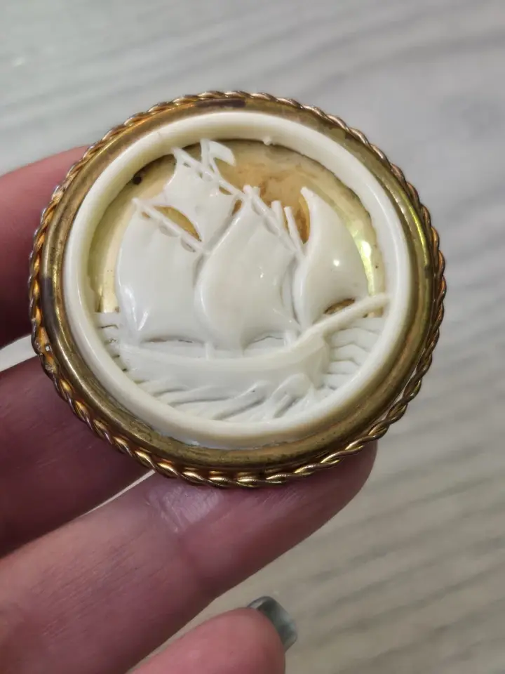 1930s Trombone Clasp Lucite Cameo Brooch Ship, Boat