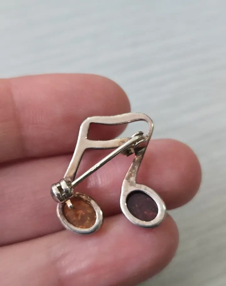 Amber & Silver Musical Note Brooch Pin - Vintage Hallmarked