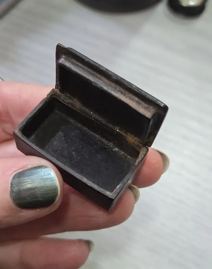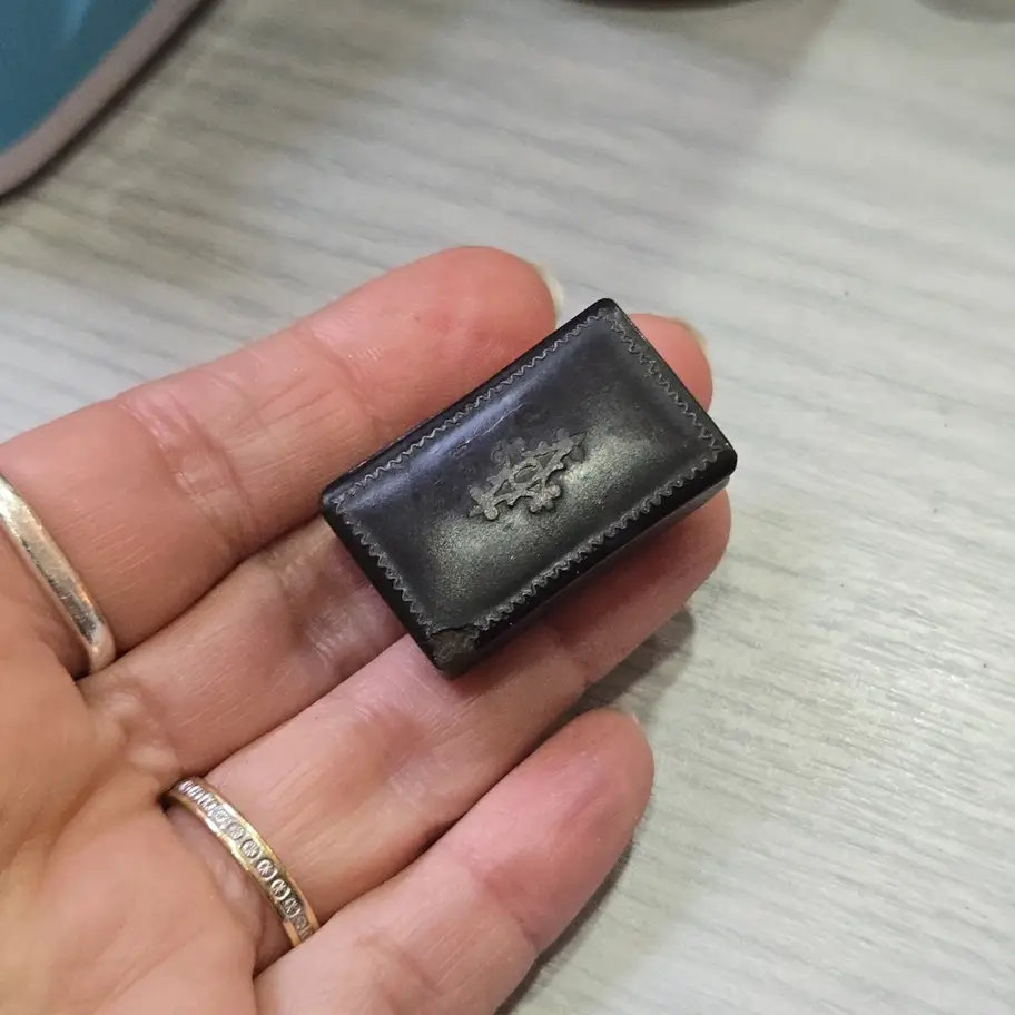 This is extra sweet. In good antique condition, it has a minor chip on the corner from the lid, please study photos. Still super sweet and good condition. Measures approx 3cm. Thanks for looking:-)