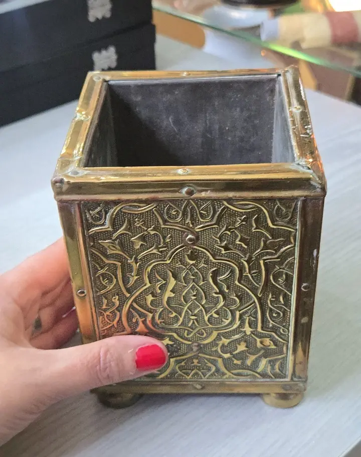 Very attractive tea caddy in good condition for its age. Done in Arts&Crafts style with ship embossed design and lid holder also in the form of a ship design and Victory word on it. Dates from around 1910- 20s. Measures approx 14.5cm just the box in height and 10x10cm.