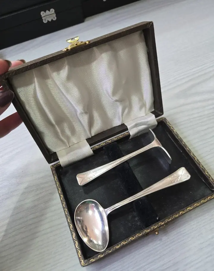 Very sweet set love the design on the spoons ,real Deco style. Great condition,the box measures approx 14x10x3cm. Thanks for looking:-)
