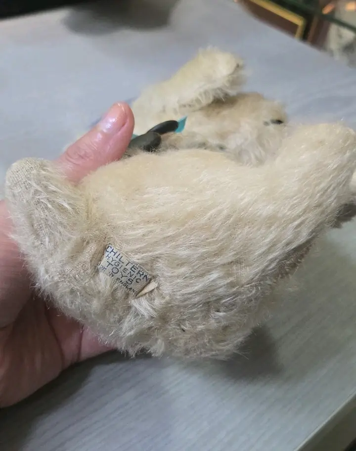 Sweet in ok condition for its age,please study photos carefully. Glass eyes,stitched nose, with leather buttons and blue hat. Approx 1940s. Measures approx 20cm. Thanks for looking:-)