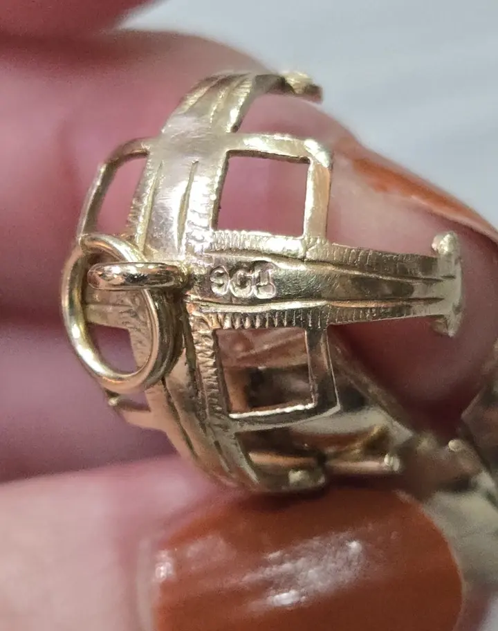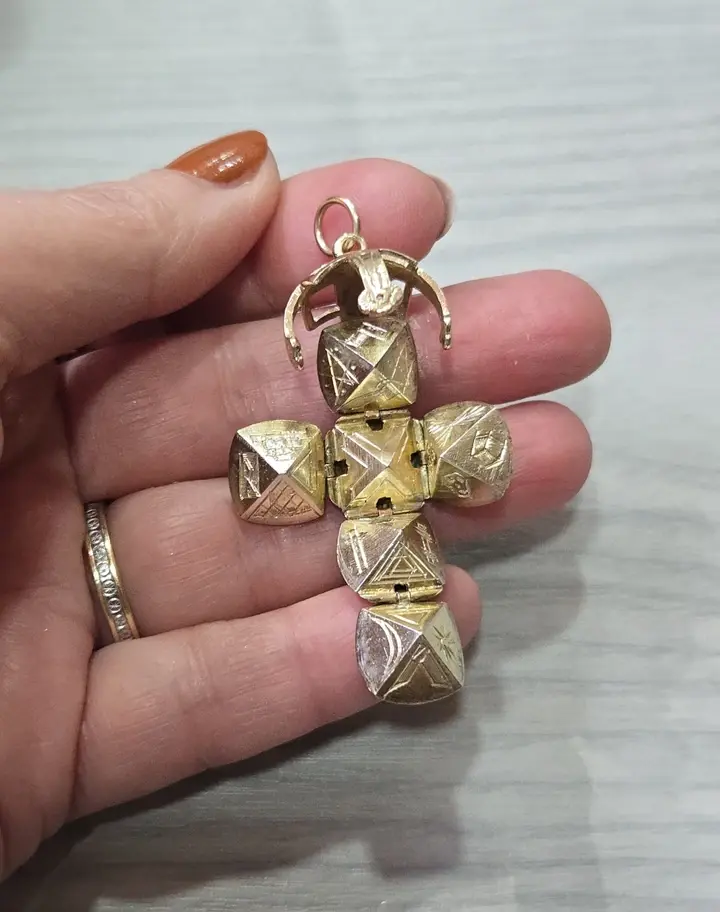 Superb antique piece in good order, small dent on the back nothing to affect its beauty. 11.8g , the cross when open is approx 5cm and the ball approx 2.5cm with the bale. The top part is stamped 9ct, and it's gold the body is silver gilt marked SIL on the back. Very attractive piece. Please study photos carefully as I took a lot of them. Thanks for looking:-) I put it on auction but if you want to Buy It Now let me know please:-)