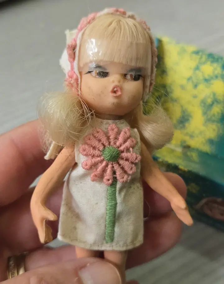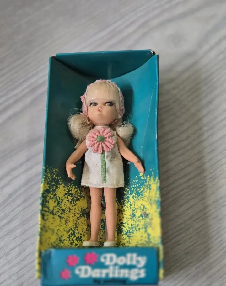 So sweet rare little doll, it is in good condition,needs a gentle clean. I don't think it's been played with it comes with the original box. Please study photos.The doll measures 10.5cm . Thanks for looking:-)