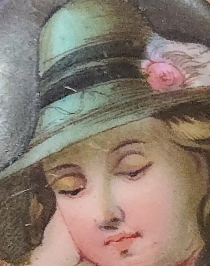 Beautiful painted. I think it's painted on marble or a strong ceramic. It is cold, so I am guessing it's a cold stone. Measures approx 3.5x2.8cm. Thanks for looking:-)