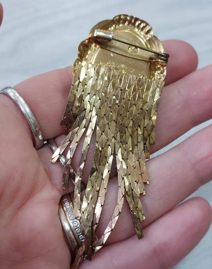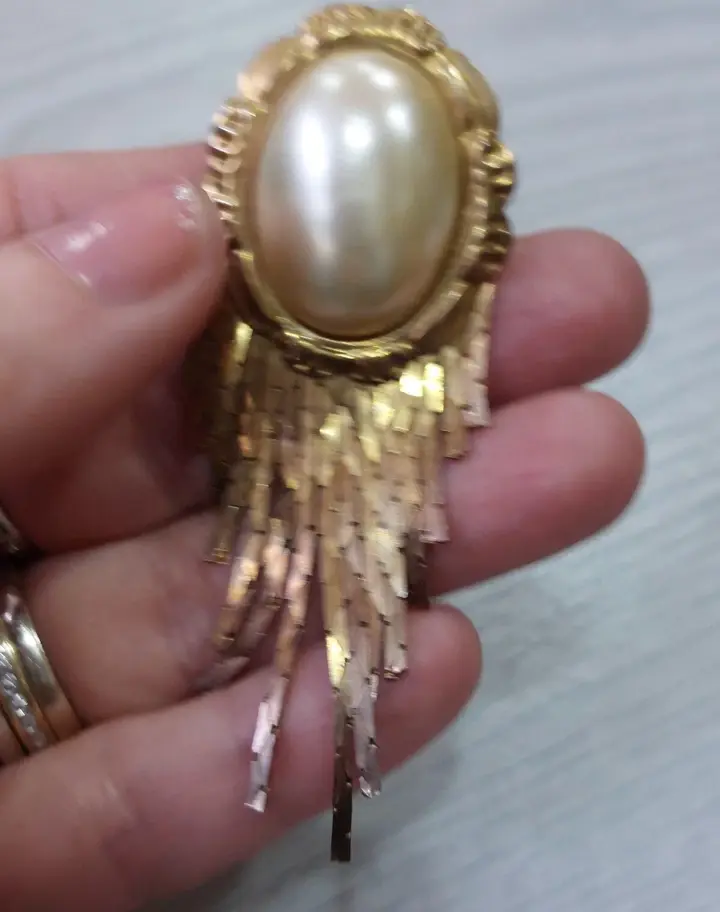 Oval Pearl Cascade Gold Fringe Brooch Victorian Revival Vintage 1980's