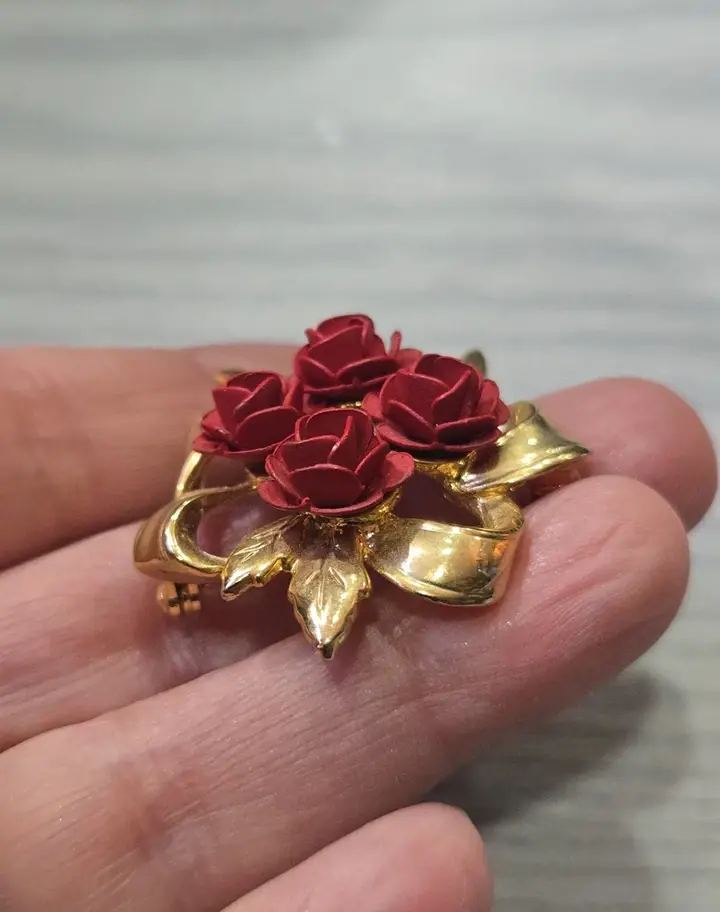 Red Roses 1980's Brooch Pin Gold Plated Vintage Pretty