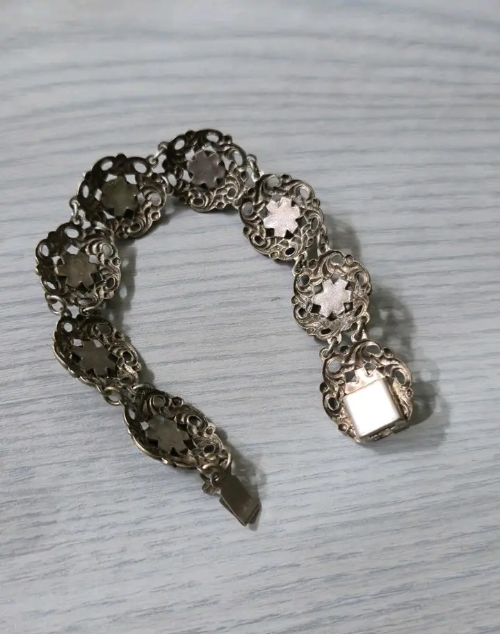 Beautiful piece in great condition with good clasps safe and secure. The flower design measures approx 2cm in diameter. It is approx 19cm long Really gorgeous bracelet:-) Thanks for looking:-)