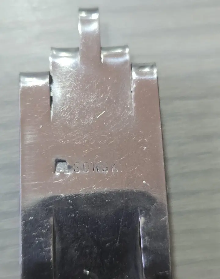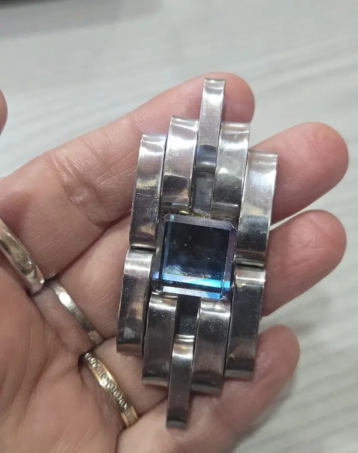 Gorgeous piece,marked Gorsk I think the I is worn, but it's Gorski. Heavy solid in a brutalist style, but Art Deco shaped. It can take different sizes chains as the hole is large. The square stone is crystal glass. The pendant measures approx 6.75x2.5cm. Circa 1960s, great piece ! Thanks for looking:-)