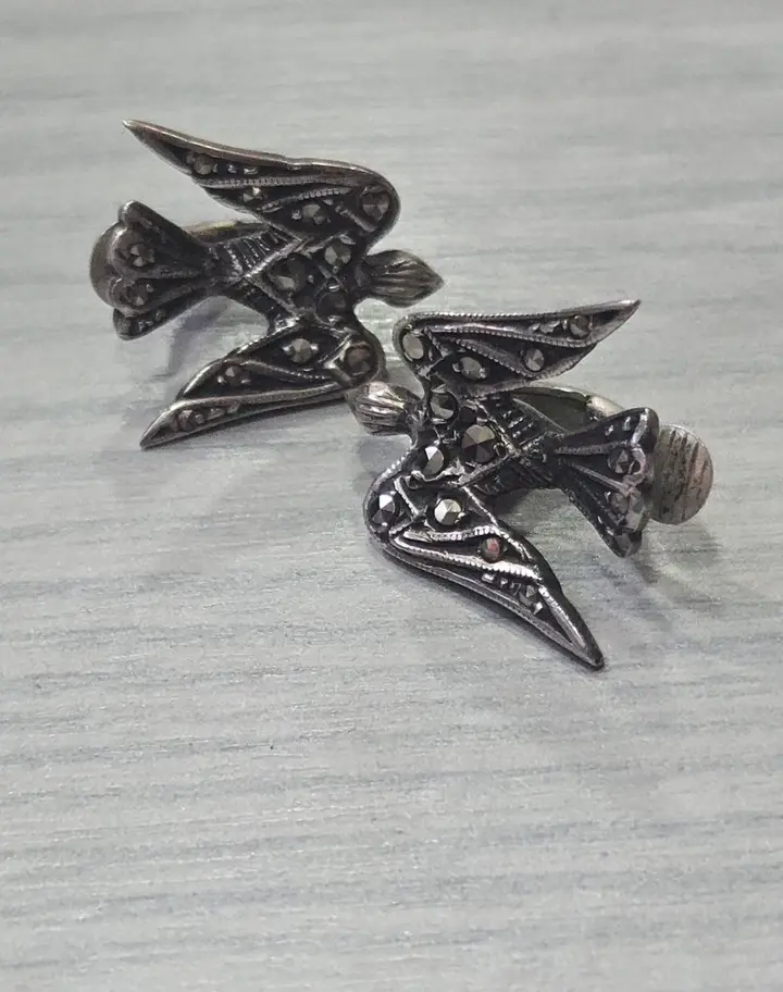 Swallow Bird Sterling Silver Earrings & Marcasite Art Deco Piece C.1930s Clip On