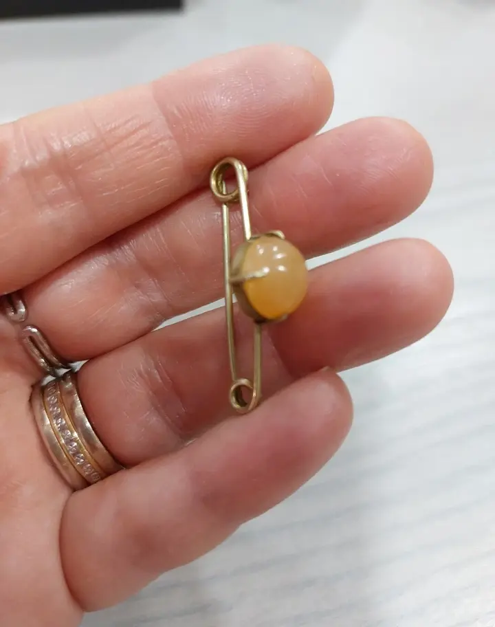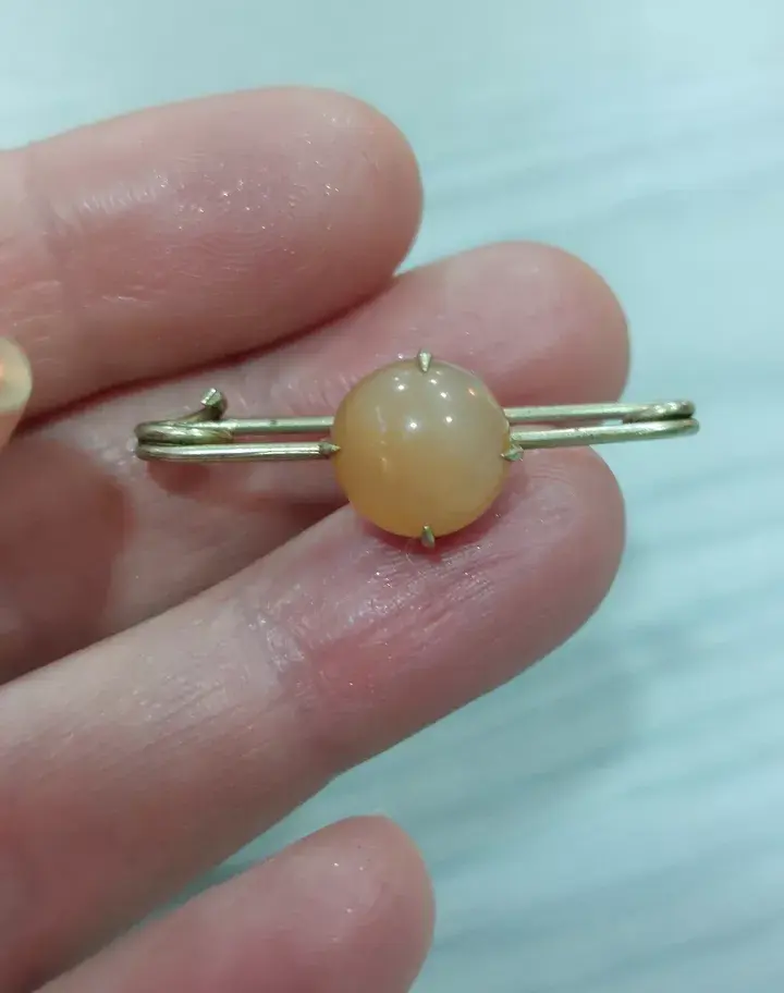 Sweet little brooch, the stone it could be jade,cold to touch or agate. In good condition. Measures approx 3.5cm