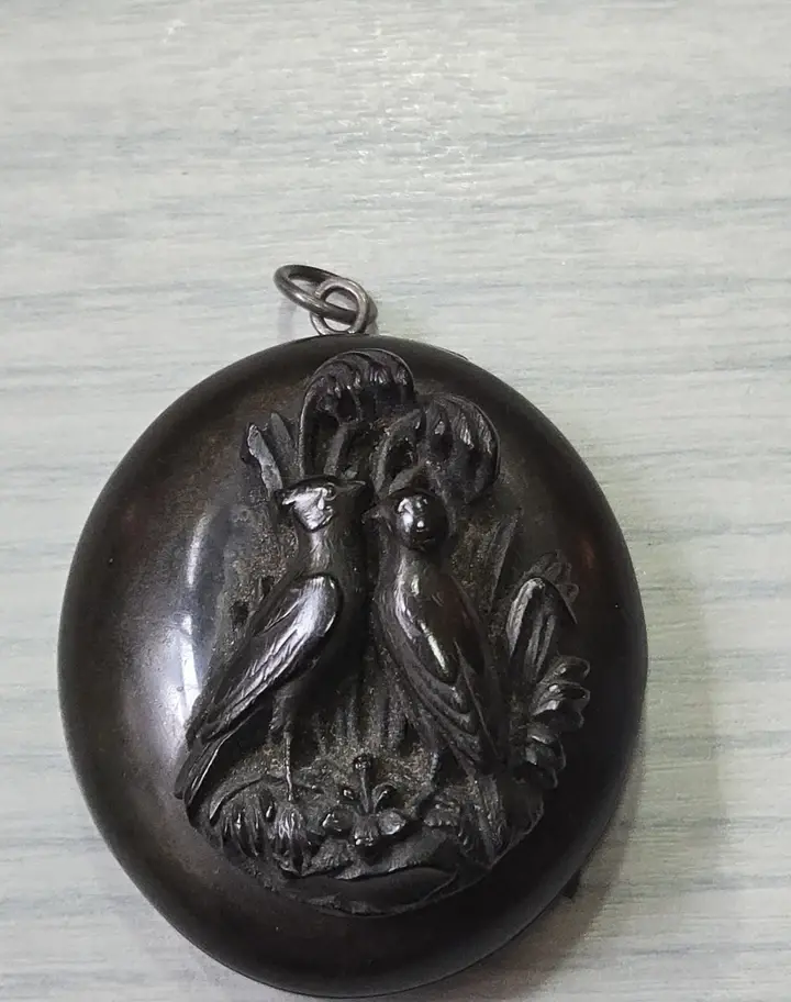 Absolutely beautiful piece 2 birds in love. The carving is very nicely made on the outer part and inside,lots of details. It closes well. There is something missing next the the bird male, another leaf, but it's still so beautiful. The price will reflect this. Measures approx 5x4cm. I love it very much. Thanks for looking:-)