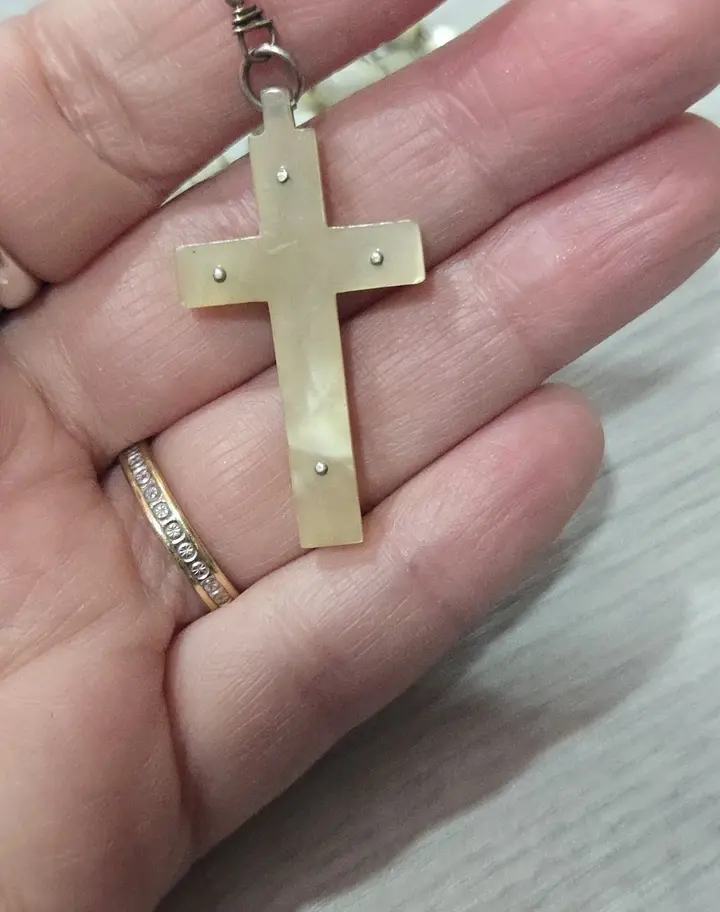 This is a very pretty piece,real antique,the beads are beautifully carved. In good condition as expected with the age, cc.1900. Measures approx 66cm the necklace plus an additional 15cm the cross and the other bit. The cross us approx 4cm. Thanks for looking:-)