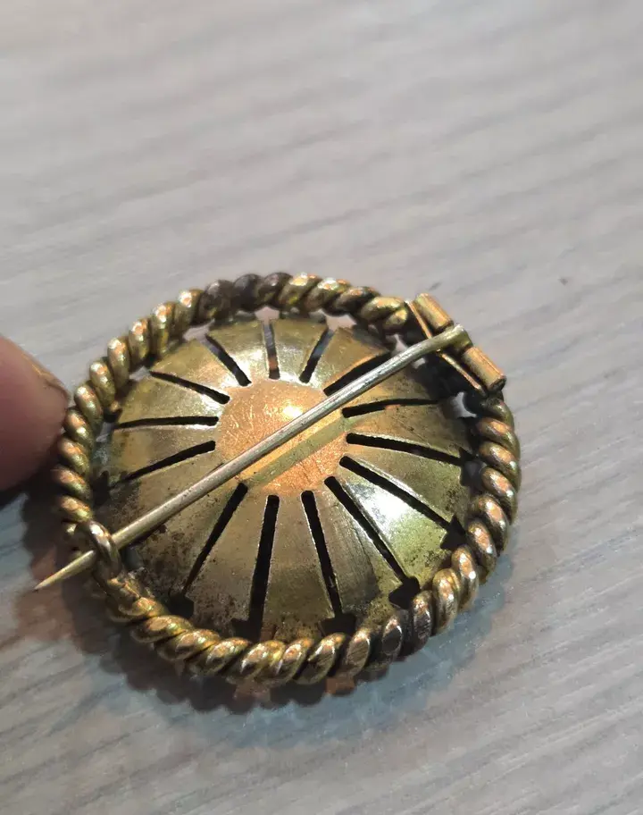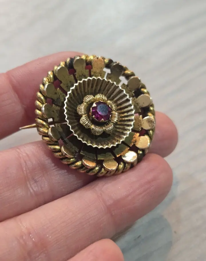 Very nice example in good condition. It has a central ruby paste( glass) stone. The condition is very good for its age. I didn't clean it, I like them like they are with their original patina but a gentle clean will make this beauty shine even more. It is gold plated over a base metal. Measures approx 3.5cm in diameter. Clasp working very secure. Thanks for looking:-)