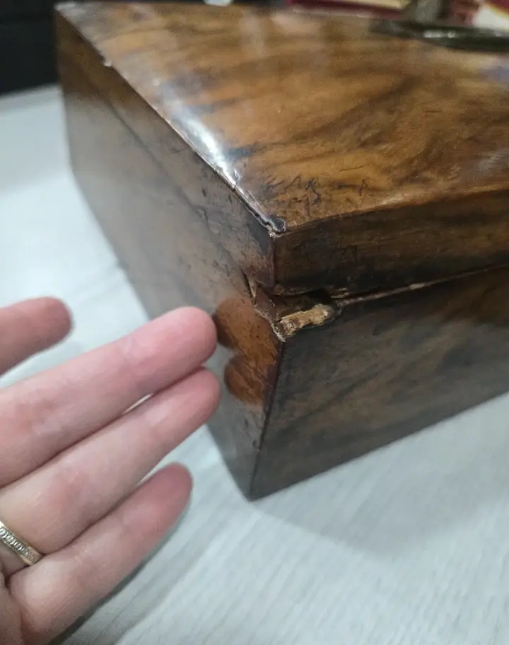 Great traveling bureau :-) It needs new hinges, the top comes off, otherwise pretty good, some minor imperfections at the corners where the hinges need fixing. These boxes are rare. Measures approx 9cm in height and 30x22.5cm. Very nice box. No key. Thanks for looking:-)