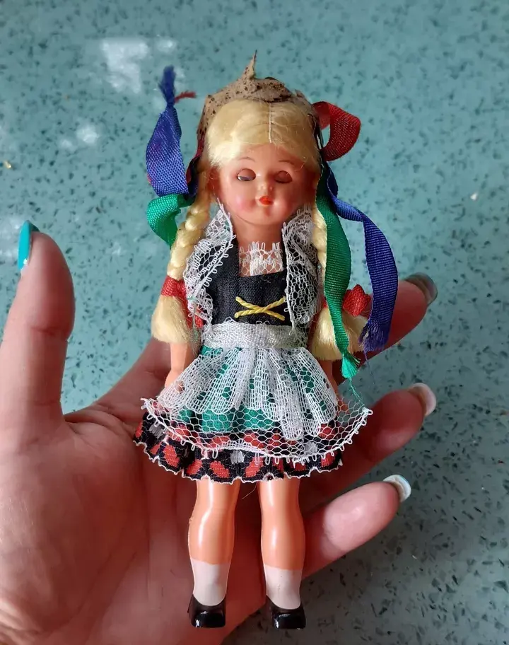 In good vintage condition, plastic made, with lace and cloth clothes,measures approx 14cm. Thanks for looking:-)